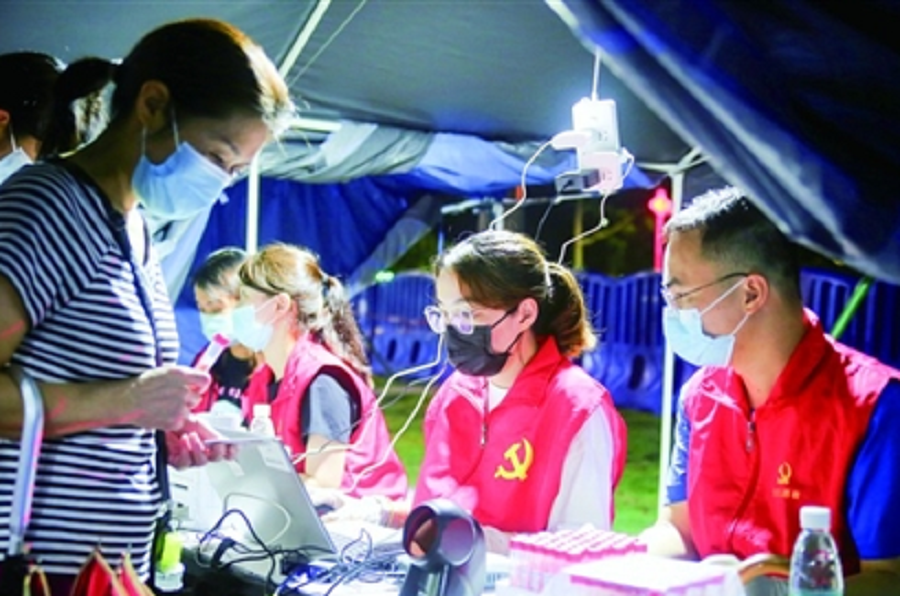 5月29日,黨員志愿者在嶺南明珠體育館核酸檢測點(diǎn)支援檢測工作。(央廣網(wǎng)發(fā) 謝曉 攝)